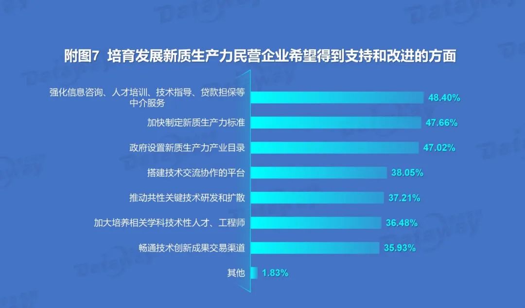 拜谒显现,48.40%的民营企业抒发了参与新质分娩力成立的利弊意愿,渴望大致取得愈加全面的指令。47.02%的企业提倡政府成立新质分娩力产业目次,通过明确发展标的与重心扶捏范围,为民营企业提供愈加明晰的发展旅途与政策红利。47.66%的企业利弊敕令政府及行业组织加速措施,制定并推论赈济的新质分娩力圭臬体系,确保时期革命与产业升级有据可依、有章可循。同期,还有48.4%的民营企业但愿强化中介处事扶直,在信息参谋、专科的东谈主才培训、精确的时期率领以及可靠的贷款担保等方面得到专科扶直。