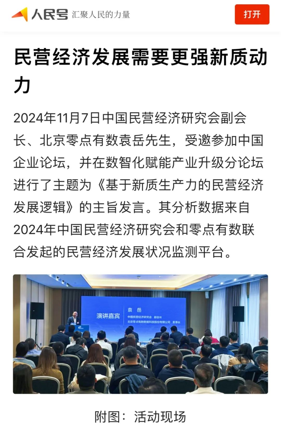 2024年11月7日中国民营经济磋商会副会长、北京零点特等数据科技股份有限公司董事长袁岳先生,受邀参加中国企业论坛,并在数智化赋能产业升级分论坛进行了主题为《基于新质分娩力的民营经济发展逻辑》的主旨发言,该论坛经东谈主民日报客户端、中国日报、新浪新闻、凤凰网等主流媒体报谈。