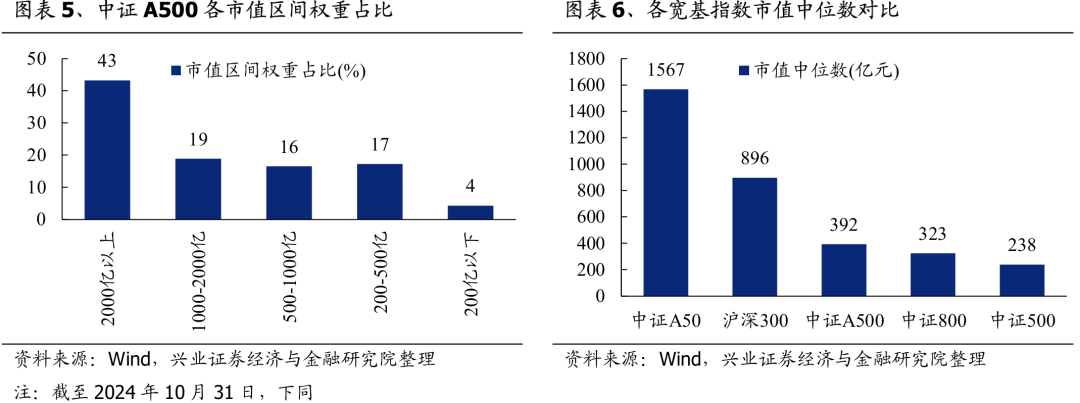 其次,市值散布方面,中证A500的主要权重仍集结在大盘股,市值2000亿元以上个股权重占比43%,市值1000亿元以上个股权重占比62%。与其他宽基指数比较,中证A500的市值中位数为392亿元,低于中证A50与沪深300,与中证800止境,因此中证A500合座来看选用了一个兼顾大盘和中小盘龙头的选股容颜。