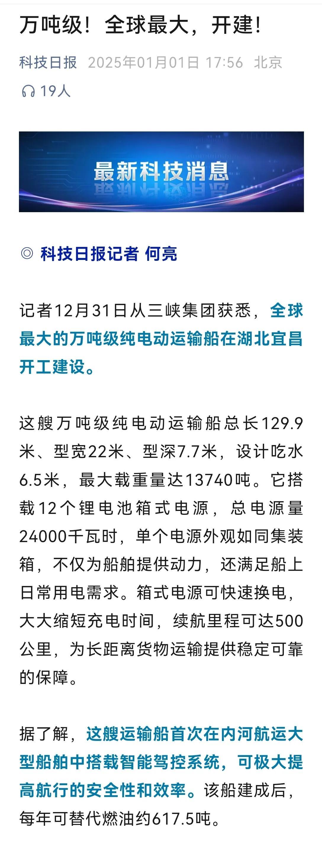 2.电动船舶当今依然不错作念到万吨级以上载重了;